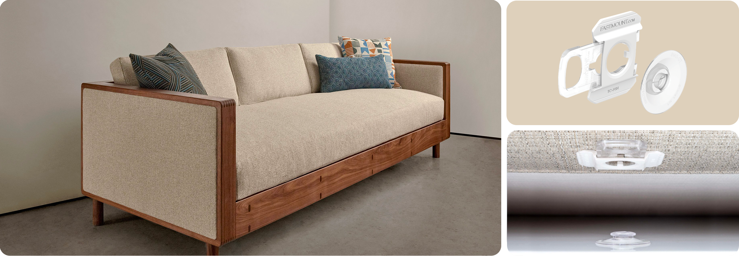 La gamme Textile est spécialement conçue pour fixer de manière invisible et sécurisée des textiles souples ou coussins sur des supports rigides ou souples, en intérieur comme en extérieur.